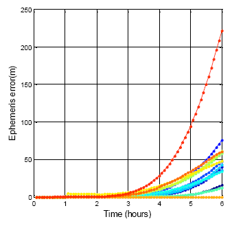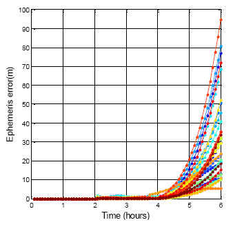 The DQA3 result for the BDS is shown in Figure 12. Compare with the GPS satellites, all the BDS satellite position errors rise after three hours. The maximum difference after the six hours is 221.5 m. This error is greater than that of the GPS due to the shorter expired time of the ephemeris. The available period of the BDS ephemeris is defined in this paper as being three hours. This result is an hour faster than the GPS ephemeris. This also explains the why the BDS ephemeris must be updated every hour. It can be concluded from the ephemeris data comparison that the time and orbit prediction system of the BDS is not as mature as that of the GPS. The BDS ephemeris data needs an integrity system to validate a new incoming ephemeris. The user positioning result will be smoother after the new ephemeris has been tested first. On the other hand, the results show that the control of the BDS satellite (by the ground control station in China) still has room for improvement.