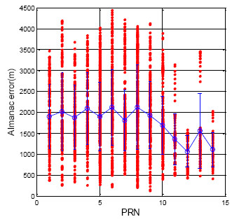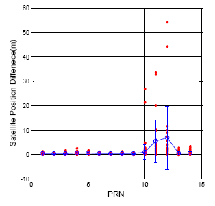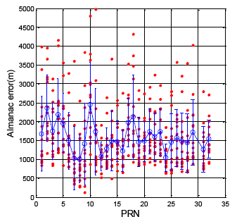 The GPS almanac update rate is close to one day. Figure 14 shows the GPS satellite position difference between almanac and ephemeris, and GPS DQA4 statistical results are summarized in Table 5. The difference value was calculated when the new almanac received. The true satellite position is calculated from the ephemeris at the same time. Compare with the true satellite position, the mean value for all GPS satellite is 1537.8 m, the maximum is 4982.2 m and the standard deviation is 716.4 m.