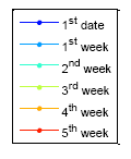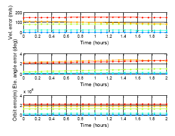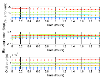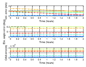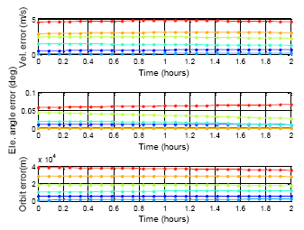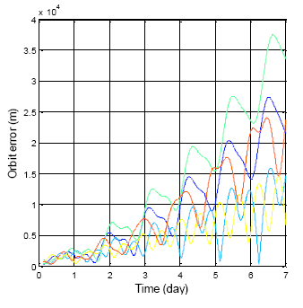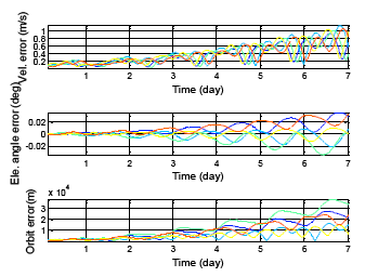 The following results presents the almanac use period for a five-week estimation. Figure 20 shows the color information for the following results: Figure 21 is the GPS five week estimation, and the statistical results are shown in Table 7. The velocity error for the maximum satellite at the fifth week is under 20 m/s. It is still far away from the threshold, which is 1427.203 m/s according to the calculation discussed in the previous paragraph. The elevation angle error for the fifth week is not more than 0.5 degrees, which is also accurate enough for satellite selection. Finally, the positioning error for the fifth week is more than 150,000 m. The result show the GPS almanac could be used for over five weeks.