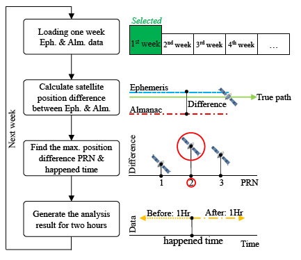 For the other constellation satellites, the user cannot continuously receive the ephemeris data due to the fact that the satellite will move outside the line of sight. In the following analysis, the maximum positioning error when the satellite ephemeris can be used during one week is calculated. As shown in Figure 19, first, one week of ephemeris and almanac data is used to calculate the satellite positioning difference for each satellite. After that, each positioning difference is compared to select the maximum satellite PRN number and record the occurrence time for that satellite. This selected satellite represents the maximum almanac error during this week. Finally, the maximum satellite information i.e., the velocity error, elevation angle error and the positioning error for two hours is calculated. These two hour analysis results are composed of one hour of data before the maximum positioning error and one hour of data after the maximum positioning error. After generating all of the results, it is necessary to go back to the first step and calculate the data for the following week.