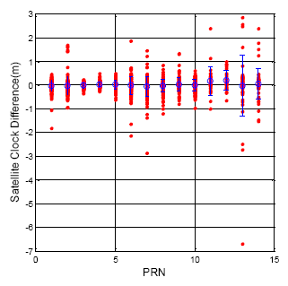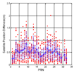 The calculation of the satellite position follows the GPS ICD and the BDS ICD. Figure 3 demonstrates the GPS satellite position difference for each satellite when the ephemeris updates (flag = 1). The analysis results are calculated for one week from 15 July to 22 July 2013. The horizontal axis presents each satellite number, and the vertical axis shows the position difference value. The red point in Figure 3 demonstrates the position difference for every satellite. The blue circle and blue bar represent the mean and the standard deviation value for each satellite, respectively. The Maxima of the update difference is 2.01 m. The total satellite mean value is 0.50 m, and the standard deviation is 0.30 m.