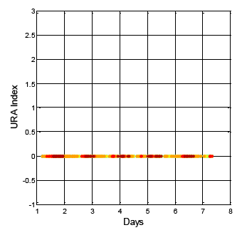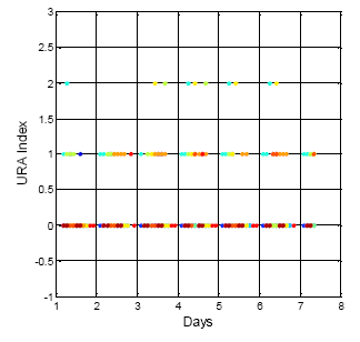 After analyzing the URA index values in the ephemeris for the same week (i.e., 15 July to 22 July 2013) the URA index values show different results than that of DQA1. The GPS result is shown in Figure 5. The vertical axis indicates the URA index value, and the horizontal axis is time. The different colors in the figure are for the different satellite results. For GPS, the URA index values vary from 0 to 2, and the corresponding URA values are from 0.0 to 4.85 m (1σ) []. In general, the broadcasted GPS URA index values are stable and have few variations. On the other hand, the broadcasted BDS URA index values are shown in Figure 6. In the collected dataset for this specific week, the BDS URA index values are very stable at 0, that is, three constellations (GEO, IGSO and MEO) of BDS URA values are all within range of 0.0 to 2.40 m []. Based on the URA results, BDS satellites could provide stable positioning service to users with sufficient accuracy. Though the URA values are one-sigma (1σ) statistical results, the objective of the work presented here is to show that there are some rare irregularities in the broadcasted BDS ephemeris and almanac data that might be potential threat to the positioning services with more stringent requirements, for instance, the performance based navigation (PBN) for aviation. If there are sudden changes in satellite position and both the new and original ephemerides are healthy, and the update period between the two ephemerides is within one hour and the URA index values are the same, then there would be no way to confirm the consistency of the ephemeris data, unless the GNSS receiver uses the DQA1 test proposed in this research to verify each satellite position and remove the large change in the satellite position due to the new ephemeris update. Moreover, if users want to improve positioning accuracy under this circumstance, a precise orbit determination is needed as suggested in [].