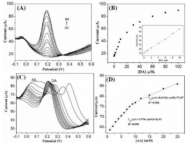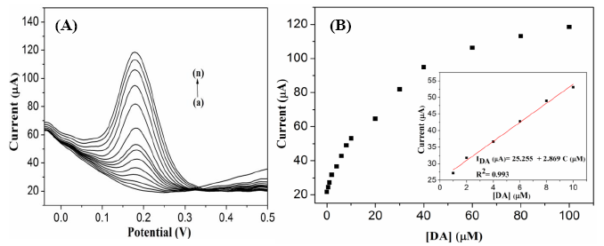 The determination of DA is further investigated by differential pulse voltammetry (DPV) in the presence of AA. Figure 10A represents a series of DPV curves for the electrochemical oxidation currents for DA at a fixed concentration of 2 mM AA at G1F5/GCE. Figure 10A clearly represents that the DPV peak current for DA is linearly proportional with increasing concentration of DA in the solutions and two distinguish peaks correspond to the AA and DA are observed at about −46 and 189 mV, respectively. By varying the concentration of DA (0.5–100 μM), the anodic peak of AA is almost stable and no obvious changes in the peak current of AA are observed in the DPV curve. Hence, the coexisting species AA has induced no interference effect in the determination of DA at the G1F5/GCE.
