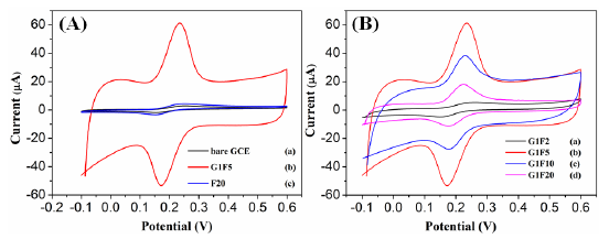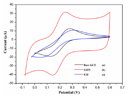 The electrochemical behavior of different modified electrodes was investigated to elucidate their electron transfer behavior in the presence of K3[Fe(CN)6] as a redox probe. The cyclic voltammograms for different electrodes, which are shown in Figure 2, were recorded in the presence of 5 mMK3[Fe(CN)6] and 0.1 M KCl at a scan rate of 100 mV/s. A pair of well-defined redox peak is observed with a peak to peak separation (ΔEp) of 140 mV for bare GCE, whereas the ΔEp exhibited by the G1F5/GCE and F20/GCE is about 89 and 230 mV, respectively. When compared to the bare GCE, the redox peak current has increased significantly for the Fe3O4/rGO/GCEs. This improved electrochemical behavior can be attributed to the excellent electrical conductivity of the Fe3O4/rGO present on the electrode surface. The graphene with superior electrical conductivity and unique electron transport property could accelerate the electron transfer rate at the electrode/electrolyte interface. Only at F20/GCE, was a lower redox peak current observed than that of the bare GCE, owing to the rapid aggregation of nanoparticles that leads to larger particles (Figure 1c), which may significantly diminish the electrochemical properties of the electrode and hence be electroinactive [22–24].