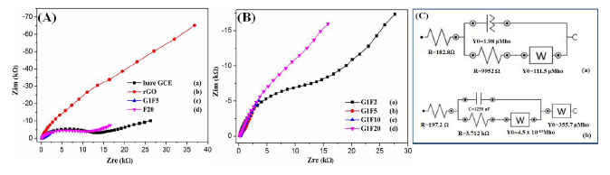 Electrochemical impedance spectroscopy (EIS) is an effective tool to probe the interfacial properties of surface-modified electrodes. Figure 3 shows the Nyquist plots observed for different electrodes in the presence of 5 mM [Fe(CN)6]3−/4− solution containing 0.1 M KCl in the frequency range from 10−1 to 104 Hz. A Randels equivalent circuit was used in the EIS spectra to obtain value of charge transfer resistance (RctΩ), where the Rs, Rct, W and QCPE refer to the solution resistance, charge transfer resistance, Warburg impedance and constant phase element, respectively (Figure 3C) and their corresponding parameters are summarized in Table 1 [25]. The F20/GCE (Figure 3A(d)) showed a large and remarkable increase in the semicircle diameter. The high resistance (9.95 kΩ) that might cause by the aggregated Fe3O4 could diminish the electron transfer process. The rGO/GCE showed a straight line and suggests that graphene sheets can facilitate the electron transfer process. However, coupling the magnetic particles with graphene sheets, the EIS of modified electrodes display almost a straight line, indicating low interfacial electron transfer resistance and promotion of electron transfer process for the nanocomposites (Figure 3B). This may be attributed to the larger surface area and good conductivity of the Fe3O4/rGO nanocomposites [26,27]. Among the different composition of Fe3O4/rGO, the G1F5 showed very small straight line due to the high interfacial electron transfer process and low charge transfer resistant.