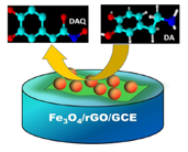 : The fabrication of an electrochemical sensor based on an iron oxide/graphene modified glassy carbon electrode (Fe3O4/rGO/GCE) and its simultaneous detection of dopamine (DA) and ascorbic acid (AA) is described here. The Fe3O4/rGO nanocomposite was synthesized via a simple, one step in-situ wet chemical method and characterized by different techniques. The presence of Fe3O4 nanoparticles on the surface of rGO sheets was confirmed by FESEM and TEM images. The electrochemical behavior of Fe3O4/rGO/GCE towards electrocatalytic oxidation of DA was investigated by cyclic voltammetry (CV) and differential pulse voltammetry (DPV) analysis. The electrochemical studies revealed that the Fe3O4/rGO/GCE dramatically increased the current response against the DA, due to the synergistic effect emerged between Fe3O4 and rGO. This implies that Fe3O4/rGO/GCE could exhibit excellent electrocatalytic activity and remarkable electron transfer kinetics towards the oxidation of DA. Moreover, the modified sensor electrode portrayed sensitivity and selectivity for simultaneous determination of AA and DA. The observed DPVs response linearly depends on AA and DA concentration in the range of 1–9 mM and 0.5–100 μM, with correlation coefficients of 0.995 and 0.996, respectively. The detection limit of (S/N = 3) was found to be 0.42 and 0.12 μM for AA and DA, respectively.1. Introduction