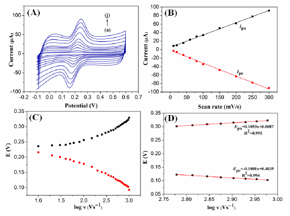 The influence of scan rates on the electrocatalytic response of G1F5/GCE electrode towards DA oxidation was examined and the results are shown in Figure 6A. It can be clearly observed that the oxidation peak currents are increased linearly while the oxidation peak potential was shifted positively with scan rate in the range from 10–300 mV/s (Figure 6A).