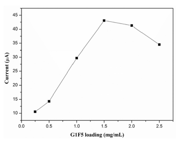The influence of G1F5 loading on the electrode surface towards the oxidation of DA was studied and the observed results are displayed in Figure 7. During the electrochemical measurement, the G1F5 volume was initially fixed as 5 μL. It is clearly seen from Figure 7 that the oxidation current response increased significantly when the concentration of G1F5 suspension increased from 0.25 mg/mL to 2.5 mg/mL due to the enhancement of the conductive surface area that influences the electron transfer rate. However, further increase of the concentration of G1F5 suspension above 1.5 mg/mL leads to a decrease in the oxidation peak current response of DA. This could be ascribed to the mass transport limitation of DA inside a thicker film and an increased mass of graphene on the electrode surface beyond the optimum level results in a shift in the oxidative over-potential towards electropositive regions and also decreases the current response [35,36]. Hence, the concentration of 1.5 mg/mL G1F5 was chosen to modify the electrode.