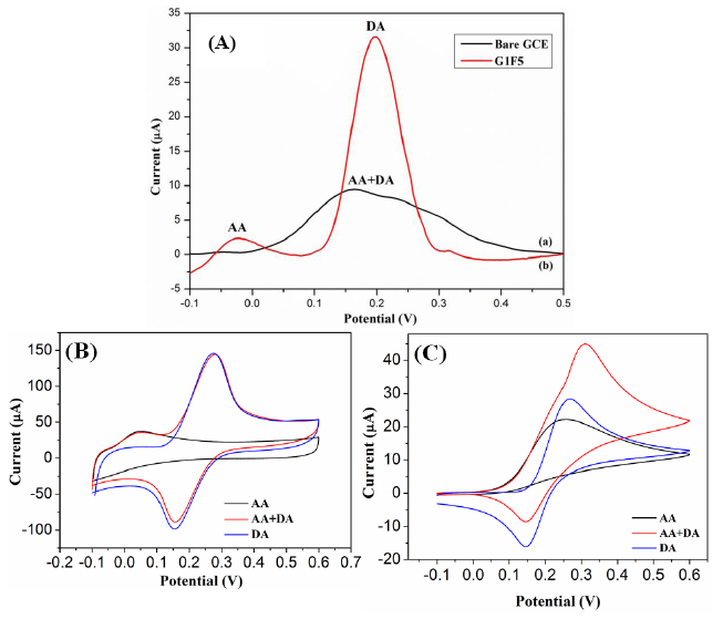 To evaluate the selectivity of electrochemical sensor, the influence of interfering species, ascorbic acid (AA) was examined in 0.1 M PBS containing 0.1 mM DA. Figure 9A shows the DPV responses of simultaneous oxidation of DA and AA at the bare GCE and G1F5/GCE electrodes. During the simultaneous detection of DA and AA at the bare GCE, the oxidation peak potentials of AA and DA are obviously overlapping and indefinable due to the poor selectivity. AA directly interferes with DA, so the bare GCE fails to determine the individual electrochemical redox peaks for DA (Figure 9A(a)). Interestingly, the G1F5/GCE modified electrode showed a significantly increased peak current for DA as well as the overlapped peak is resolved and clearly showed the individual electrocatalytic oxidation peaks for DA and AA at about 0.19 and 0.025 V, respectively (Figure 9A(b)). In addition, the strong electrostatic interaction and π-π conjugation emerged between the aromatic regions of positively charged DA and negatively charged G1F5 makes the electron transfer favorable and enhance the oxidation of DA to electrode surface, hence the AA oxidation is inactive and inhibited [37]. Figure 9A suggests that the G1F5/GCE has excellent electrocatalytic activity towards the oxidation of DA than AA and exert no interference in the selective determination of DA. Further to confirm the selectivity of the G1F5/GCE, the cyclic voltammograms also recorded for DA, AA and DA+AA and are shown in Figure 9B and it can be clearly seen the DA and AA showed well resolved characteristic two peaks due to DA and AA. In contrast, peaks due to DA and AA are merged together in bare GCE (Figure 9C).