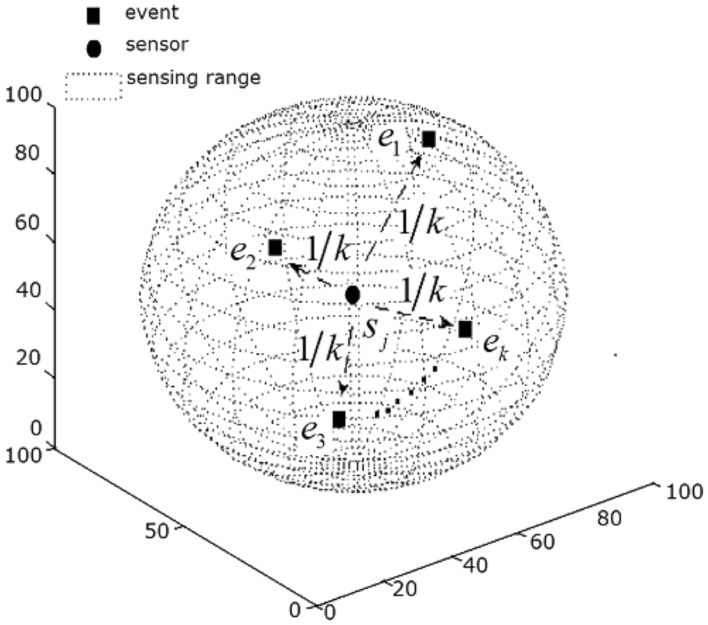 Coverage. Consider an event at location ei ∈ A, if , we call ei is covered by sj. Here d(ei, sj) is the Euclidean distance between ei and sj. If e1,e2,…,ek are all covered by sj (Figure 1), sj is “divided” equally among all events, and each event shares 1/k of sensor j.
