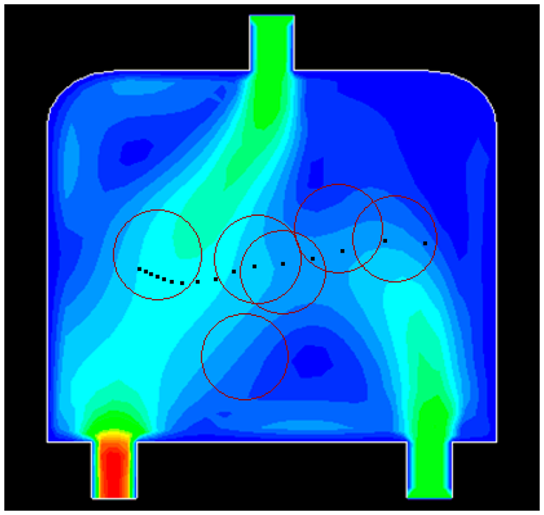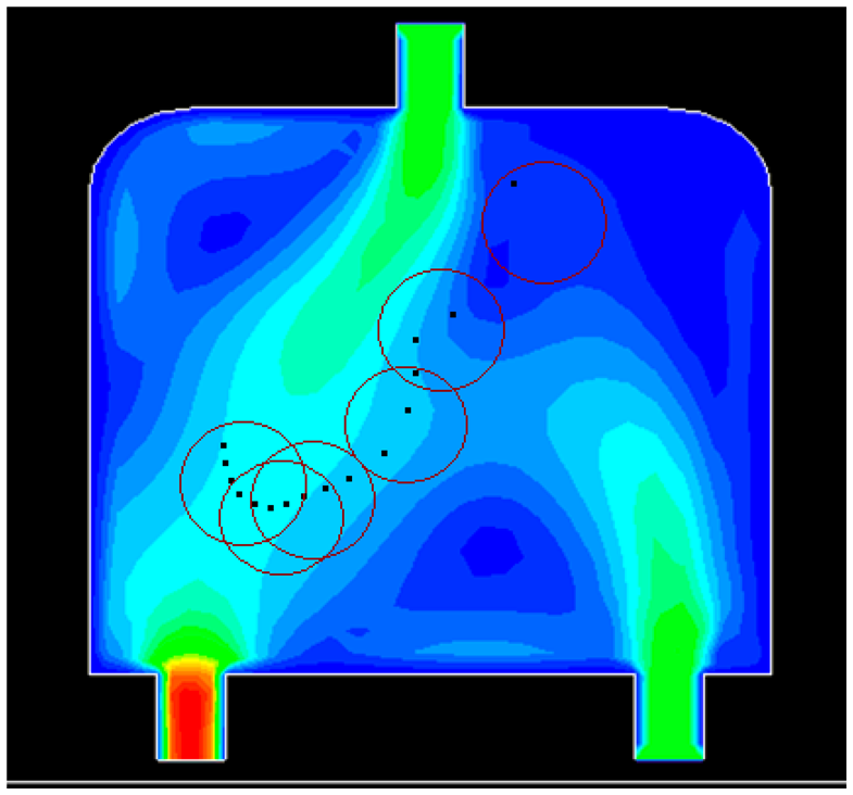 Initially, 16 events are distributed non-uniformly along a line in the water flow environment (Figure 10). The black dots denote the events. Six sensors are deployed randomly in the field. The red circle represents the sensing area of a sensor. Figures 10, 11, 12 and 13 show the distribution of the events and sensors at four time points during the execution of the algorithm. Evidently, the sensors swarm toward and eventually cover the events, adjusting their positions with the moving events, and maintaining the optimal coverage over time. Figure 14 shows the changes in the coverage efficiency η(E) over time. It is clear that after time t2, the sensor deployment becomes stable with η(E) fluctuates between 0.8 and 0.9, achieving high monitoring quality.