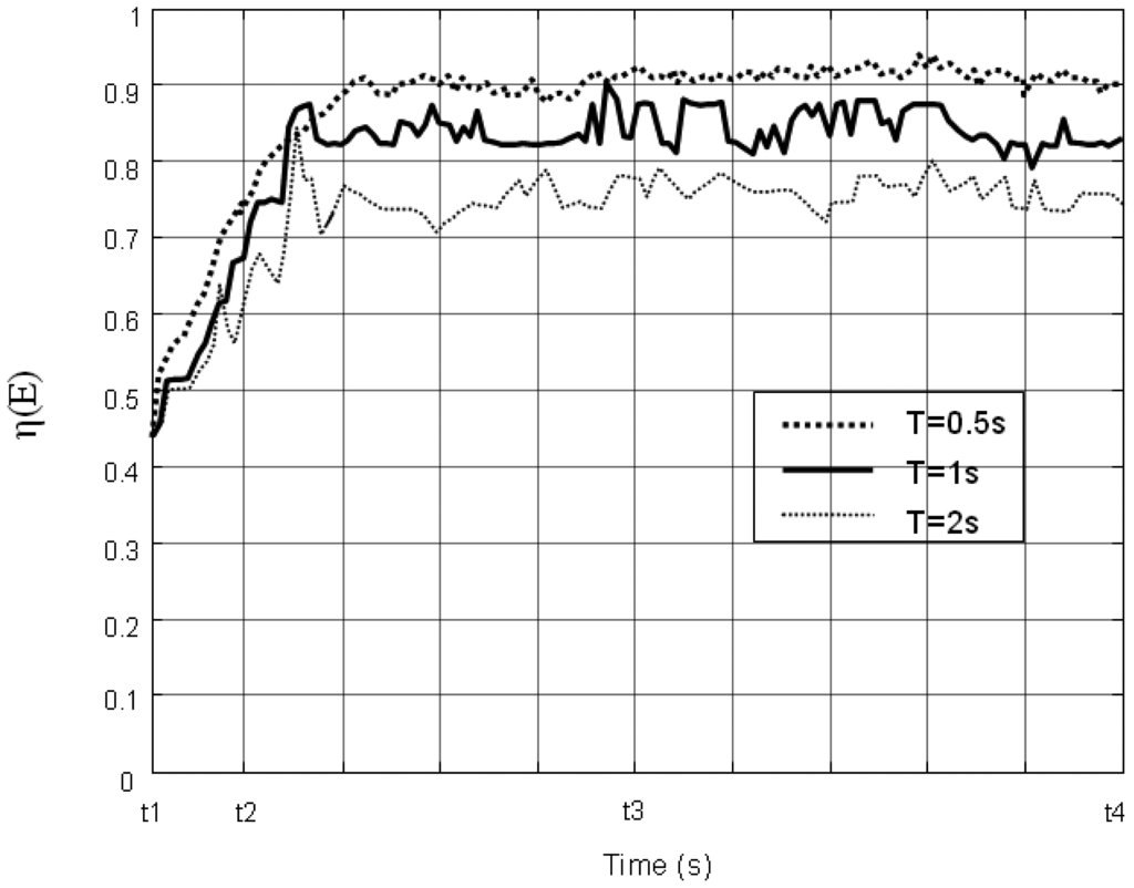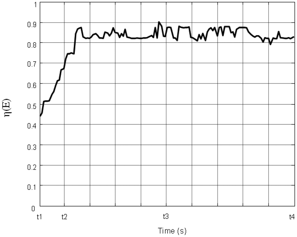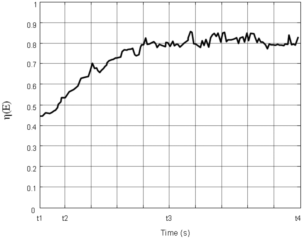 Because the proposed moving strategy can overcome or use the inertia and the water flow to move, as described in Equation (14), the moving efficiency of the sensor is improved. Furthermore, sensors can save energy. Another experiment is conducted to show this point. We modify Equation (14) as . The dynamic simulation experiment result is shown in Figure 15. It shows that the sensors spend more time on moving to cover the events. As a result, more energy is consumed. Even if in the stable stage, η (E) is around 0.8. The monitoring quality decreased.