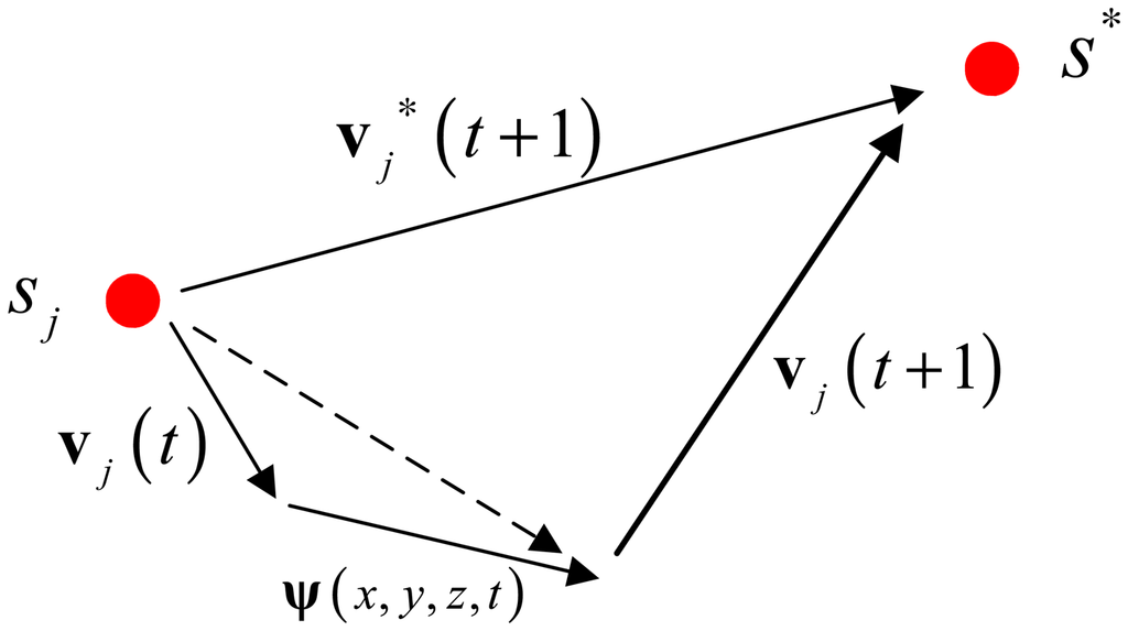 Since the movement of the sensor will be affected by its inertia and the water flow, sj should either overcome or take advantage of them in moving. Therefore, the actual velocity of sj is computed according to Equation (14) as illustrated in Figure 3.