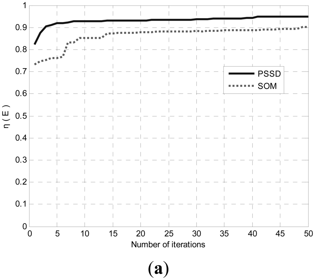 The parameter settings of the simulations are given in Table 1. The evaluation metrics for both algorithms include η(E) defined in Section 2.2, and the convergence speed. In η(E), α = β = 0.5.