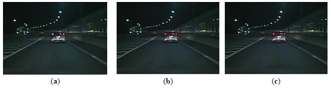 Figure 10 shows the scene where a reflector of a street lamp is in the middle of a pair of taillights, and the reflector is more similar to the right taillight. The existing global rule-based algorithm could cause a false positive detection, as shown in Figure 10b. However, the proposed algorithm can eliminate the false pairing and keep the right taillight pair by considering the relationship of vehicle location between frames, as shown in Figure 10c.