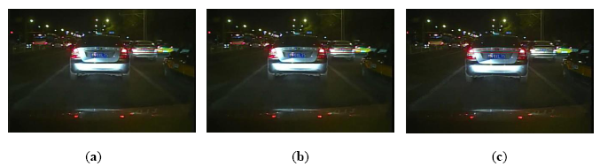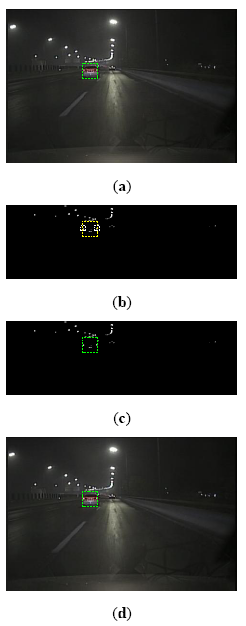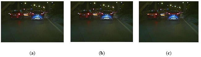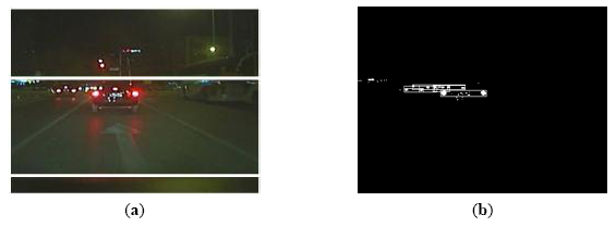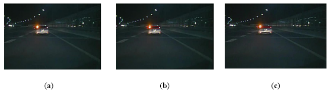 Due to the low contrast between vehicles and the background under badly illuminated conditions in nighttime road environments, the typical features applied to detect vehicles in the daytime, such as vehicle shadows, horizontal and vertical edges, and corners, cannot work well. The most significant feature of night preceding vehicles in dark environments is their red and bright taillights, and many studies of preceding vehicle detection at night have been completed by detecting the taillights [8–25].
