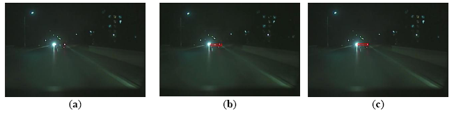 Figure 12 shows a scene where the similarity of a pair of taillights is broken because the left turn light is flashing. The global rule-based algorithm would cause a false negative detection, as shown in Figure 12b. As the vehicle tracking strategy is based on taillight estimation, the disturbed taillight is located according to the undisturbed taillight. Thus, the proposed algorithm can obtain the taillight pair accurately, as shown in Figure 12c. Figure 13 describes a scene where one taillight is adhering to the headlight of the oncoming vehicle. The global rule-based algorithm could not pair the taillights, as shown in Figure 13b. Nevertheless, the proposed algorithm can obtain the correct vehicle location, as shown in Figure 13c. Figure 14 describes a scene where one taillight was adhering to the reflector in the back of the preceding vehicle, and the similar results are shown in Figure 14b and Figure 14c. Therefore, the experimental results shown in Figure 12, 13 through 14 indicate that the proposed algorithm can track a vehicle correctly and robustly, and thus the false negative detection rates can be reduced simultaneously.
