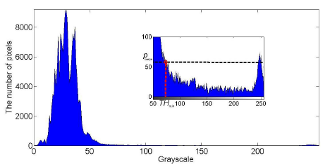 In order to reduce the computation complexity, the lower boundary of the threshold could be estimated according to the distribution of the whole image histogram. In one original image, Gmax denotes the maximum grayscale in the whole image, and p(i) represents the proportion of pixels with a grayscale of i. Then, as shown in Figure 2, the average of proportion pmean between Gmax − δ and Gmax could be calculated as follows: