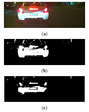 The result of taillight segmentation by the proposed method is shown in Figure 3. It can be observed that the real taillight is adjoined with the brighter reflector in the back of the car in the segmentation image by the common OTSU method, as shown in Figure 3b. However, the proposed method could extract the taillights entirely, as shown in Figure 3c. Hence, the proposed method could extract the real taillights from the background effectively.