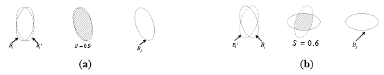 Because the taillights were placed symmetrically on the vehicle, the symmetry of the two spots in a pair could be applied to remove some non-taillight pairs. Supposing Bi and Bj are two spots in a pair, and Bi′ is the mirror image of Bi. Then the symmetry of the two spots Bi and Bj could be represented by the similarity of Bi′ and Bj. Counting the number of pixels overlapped on Bi′ and Bj, which is denoted as As, then the similarity could be represented as follows: