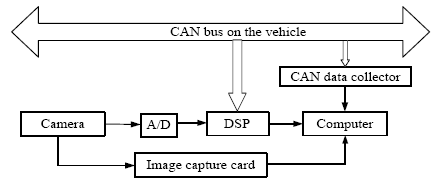 The platform is constructed for testing in an actual traffic environment. A CCD camera is mounted behind the driving mirror on the experimental passenger car (see Figure 8), and it is used to continuously monitor the traffic scenes when the car is moving. The camera is embedded in the camera assembly, and the assembly is firmly attached onto the front windshield firmly. A mobile computer equipped with an Intel Core i3 2.5 GHz processor and 2G RAM is used to capture the traffic video through an image capture card, and the captured image size is 768 × 576. The image from the camera is applied to detect and track the front vehicle based on digital signal processing (DSP), and the result could also be collected by the mobile computer. The current status of the ego-vehicle is collected from the CAN bus on the vehicle by the corresponding data collector. The structure of the experimental system is shown in Figure 9.