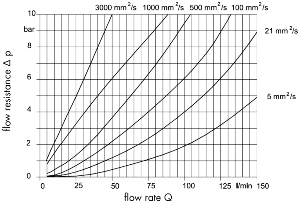 The rotary PD meter with a pair of profile shifted gears as its rotors is another kind of widely used flowmeter, which is very common in high pressure hydraulic control systems because of its wide measurement range and high accuracy [11,12]. However, the displacement of this kind of PD meter is so small that the rotor speed is too high and the pressure loss can be unbearable in some circumstances. Figure 1 presents the pressure loss curves of this kind of flowmeter [13]. When the kinematic viscosity of the oil is 100 cst and the flow rate is 100 L/min, the pressure loss is almost 6 bar. Another problem is that its high rotation speed under a large differential pressure shortens the bearing life.