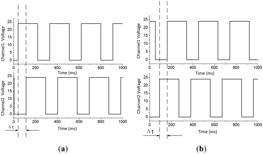 The two square wave outputs shown in Figure 10 are produced by the two Hall sensors for a flow rate of 10.3 L/min through the standard flowmeter. When oil flows forward in the flowmeter, the output from channel 1 advances approximately π/4 radians over channel 2, as shown in Figure 10a. Conversely, the output from channel 1 lags behind channel 2 when the oil flows backwards. Thus, the sensor installed in the cycloid rotor flowmeter is working, the flow direction can be easily read from the sensor, and the flow rate can be calculated by recording the time during one pulse.