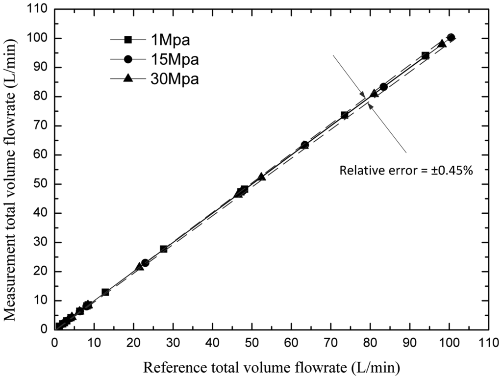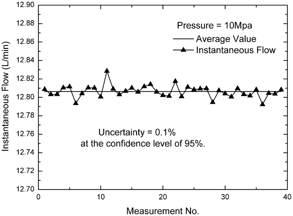 Figure 14 compares a larger number of results given by the tested flowmeter with the ones given by the standard flowmeter. If all points locate at the angle bisector, it shows that there is no error. As shown, all measurement results distribute in a range with the relative errors of less than ±0.45%. From all the results and analysis, a conclusion can be obtained that the relative errors of the flowmeter under test are mainly due to the internal leakage rather than the reading uncertainty.