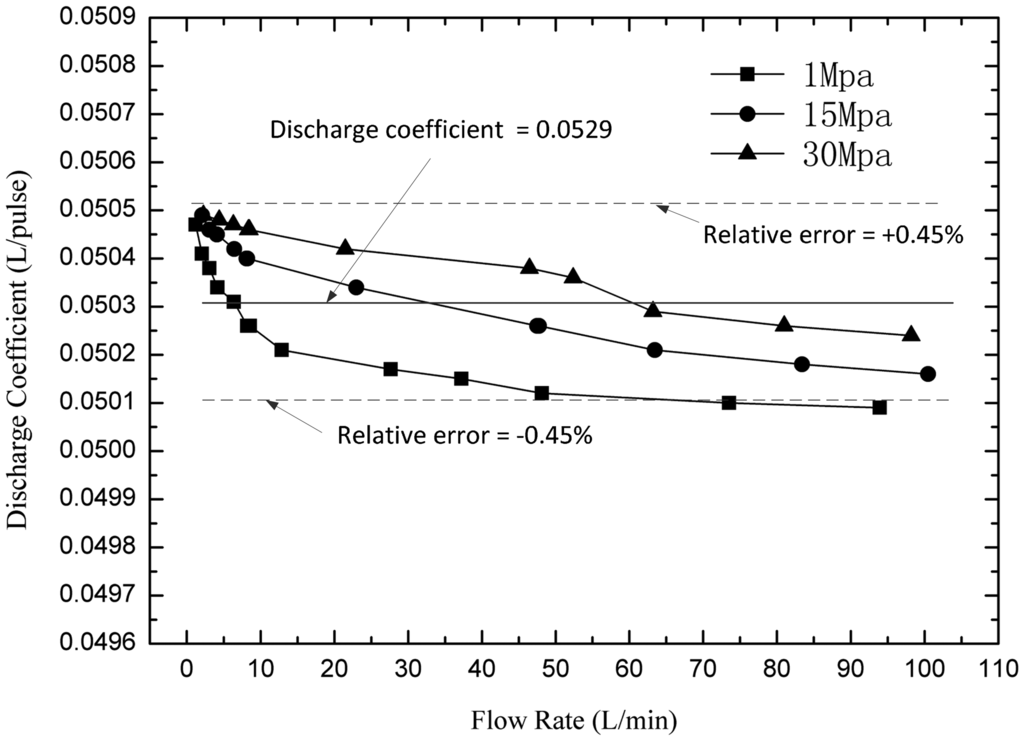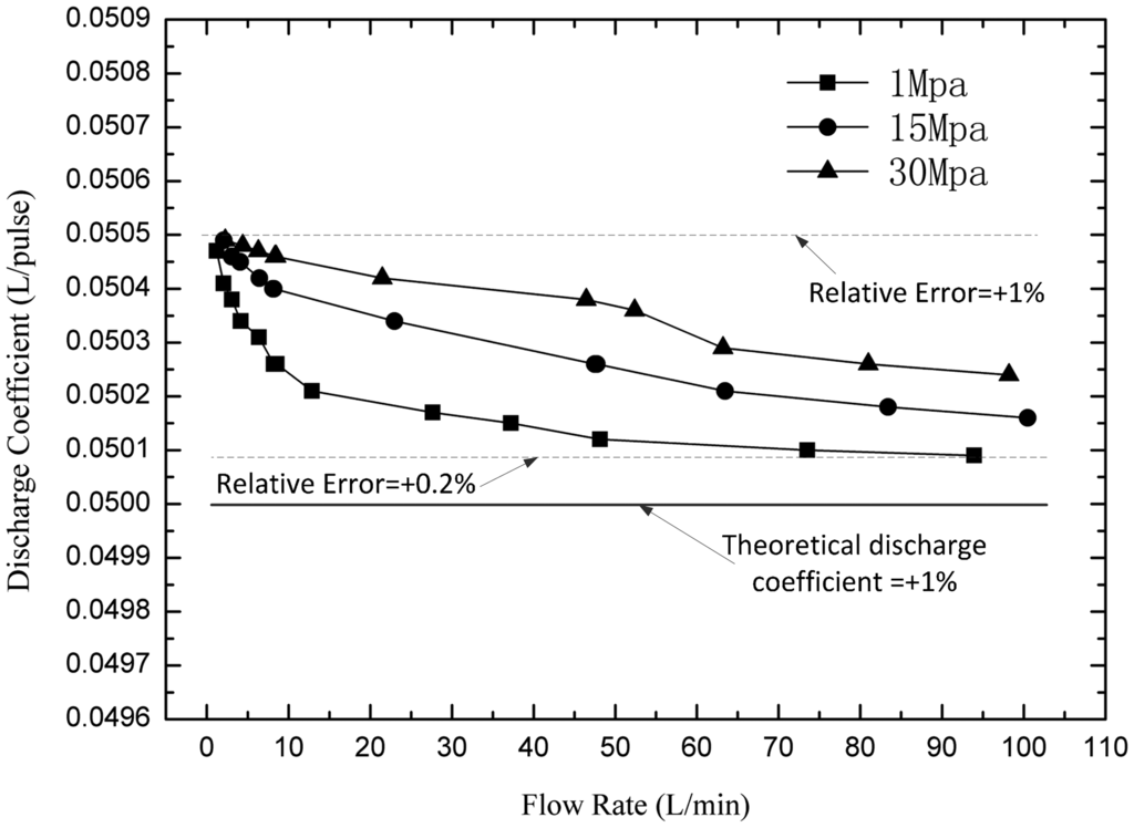 From the results, the discharge coefficients change with pressure and flow rate. The most important reason is internal leakage. The internal leakage is a function of clearance width cubed, clearance length, viscosity, and differential pressure. The internal leakage can't be entirely eliminated, but can be limited in a certain range by decreasing the clearance and differential pressure. If a constant discharge coefficient is used to calculate the final flowrate, there will be errors due to the changes of the discharge coefficients. In this research, the relative errors are between ±0.45%.