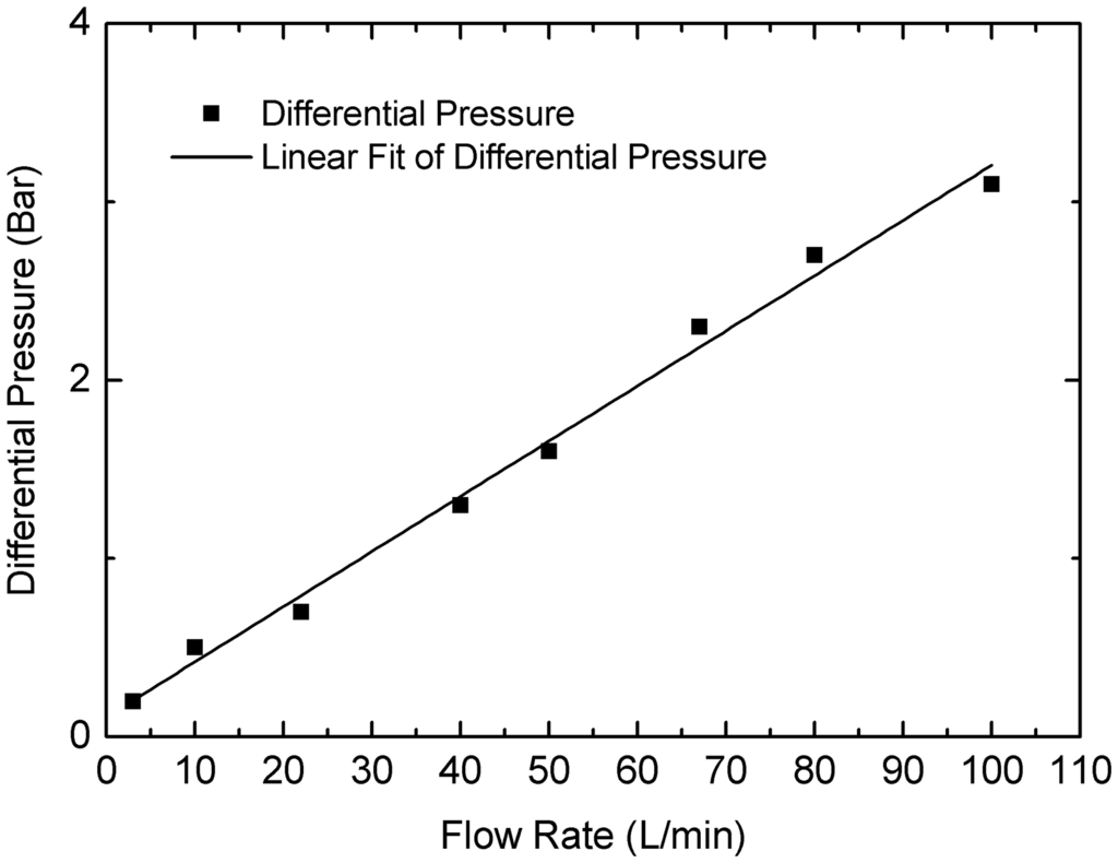 Benefiting from the internal cycloid rotors, this flowmeter rotates smoothly without any noise. Also benefiting from the internal cycloid rotors, this flowmeter has a compact structure. It is small in size but big in displacement which is helpful to reduce the pressure loss. Pressure loss is an important characteristic of a PD meter. Larger pressure losses mean larger energy losses and internal leakage. In this experiment, two pressure sensors are connected to the inlet and outlet of the flowmeter to measure the pressure differences at different flow rates. As shown in Figure 15, the differential pressure is due to the friction between moving parts and churning losses, so it has a linear correlation with the flow rate; but nothing to do with the system pressure. Since both transverse leakage and radial clearance leakage increase with the differential pressure, the internal leakage increase obviously with the differential pressure. The differential pressure of this flowmeter is almost 3 bar when the oil flow rate is 100 L/min and the kinematic viscosity of the oil is 100 cst, which is only half as much as the differential pressure of the rotary PD meter with a pair of profile shifted gears shown in Figure 1.