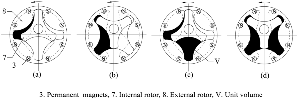 Therefore, the accumulated flow qac due to the rotations of the external rotor can be determined by integrating Equation (12) with α over the range from as follows: