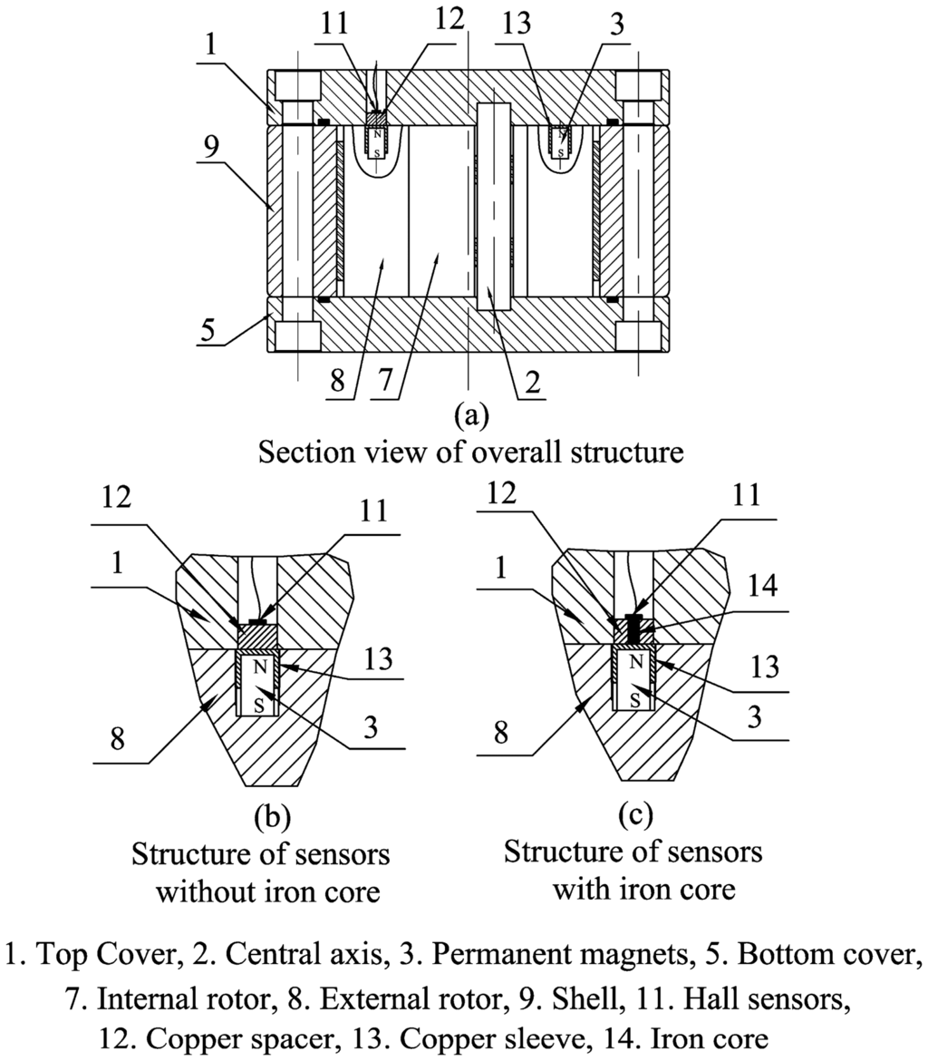 The magnetic field strength around the Hall sensor can be further enhanced if a permeable iron core is set in the spacer, as shown in Figure 4c. The two sensors in the top cover are arranged at a certain angle so that they can output two square waves with different phases to facilitate the determination of the fluid direction from the phase change.