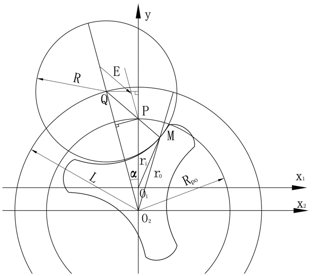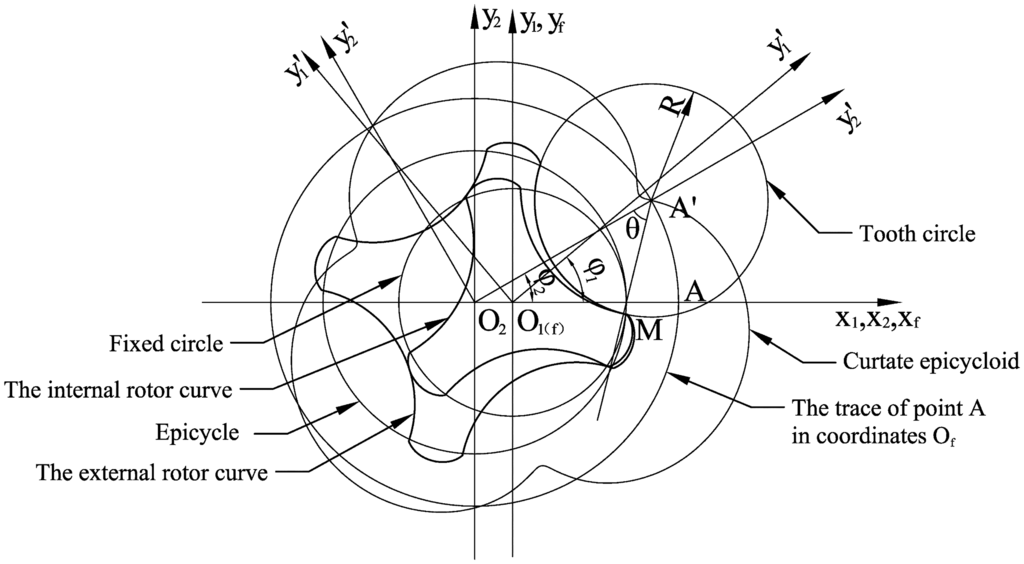 According to Figure 5, the radius of the tooth circle is R, and the centre of the tooth circle is at position A′ so that the equidistant curve must be meshed at point M. The trace of point M is the external rotor curve in the O2 coordinate system and the internal rotor curve in the O1 coordinate system.
