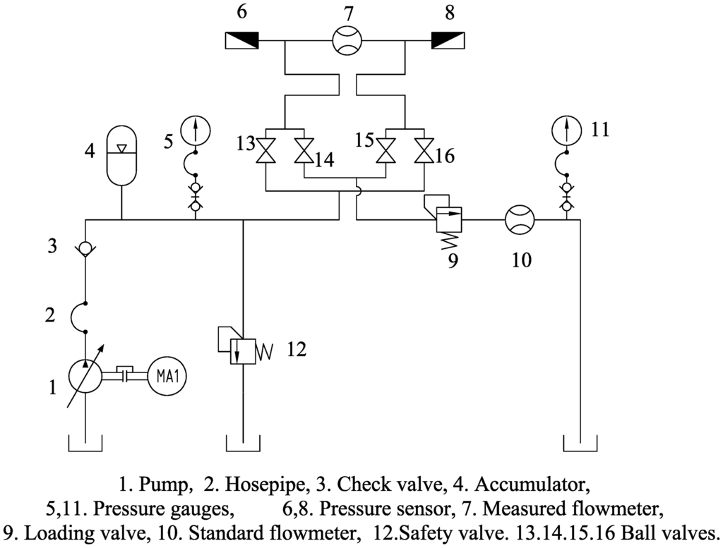 An experiment was developed to test the device characteristics, as shown in Figure 9. The experimental system included a piston variable pump, a standard oval gear flowmeter, an accumulator, a safety valve, a loading valve, four ball valves, two pressure sensors with an accuracy of 0.5% and two pressure gauges with an accuracy of 0.5%. The flow rate provided by the pump can be adjusted from 0 to 120 L/min, and the system pressure can reach a maximum of 31.5 MPa. An accumulator is used to smooth the flow and pressure pulsation caused by the piston pump. Pressure gauges are used to monitor the system pressure and back pressure. The safety valve ensures that the system pressure remains under 31.5 MPa at all times. The inlet and outlet pressures of the PD meter are monitored by the pressure sensors. The loading valve is used to change the outlet pressure of the PD meter from 0 to 31.5 MPa. The four ball valves are used to change the flow direction of the fluid in the prototype. Normally calibration of PD meter uses a standard volume vessel to measure the fluid volume through the flowmeter. But in this research, the calibration system uses a high accuracy standard oval gear flowmeter with the accuracy of ±0.1% to simplify the calibration process. Since the accuracy of the standard flowmeter is high enough, its readings can be regarded as the standard value without any errors. There is no bypass between the two flowmeters, so the volume of fluid through the standard flowmeter and the cycloid rotor flowmeter is same. In this experiment, 46# antiwear hydraulic oil is used as the measured mediums, and kinematic viscosity of it is 100 cst. Fluid compressibility must be considered when the flowmeter is used to measure high pressure fluids. Fluid compressibility can be reflected by the elasticity modulus. The 46# antiwear hydraulic has different elasticity moduli when it is under different pressures as shown in Table 2 [19]. According to the elasticity modulus, the fluid compressibility can be obtained as shown in Table 3 (compared with the volume at 0 Mpa). All results given in this article have considered the compressibility of the measured media.