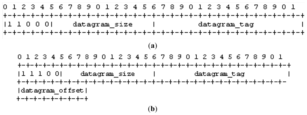 6LoWPAN introduces an adaptation layer between network and data link layers. Its primary function is to encode the IPv6 header and to fragment the packets that exceed the MTU of the MAC layer. Should a packet need to be fragmented, 6LoWPAN appends a fragmentation header [6] to each fragment of the original packet. Two distinct headers are used to indicate whether the fragment is the first or it is one of the subsequent. The main difference relies in the presence of a header field that indicates the offset of the fragmentation. This is present only in subsequent fragments. Figure 1 shows the fragmentation header for the first fragment and the subsequent fragments.