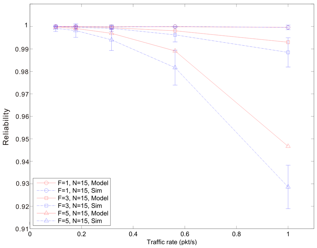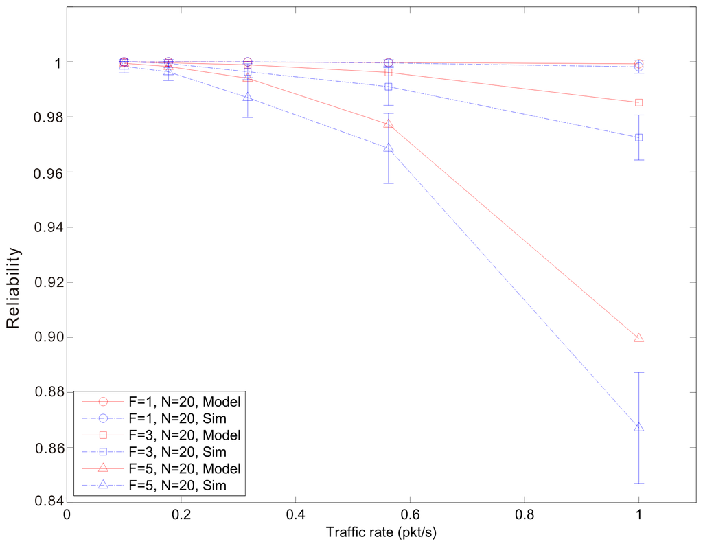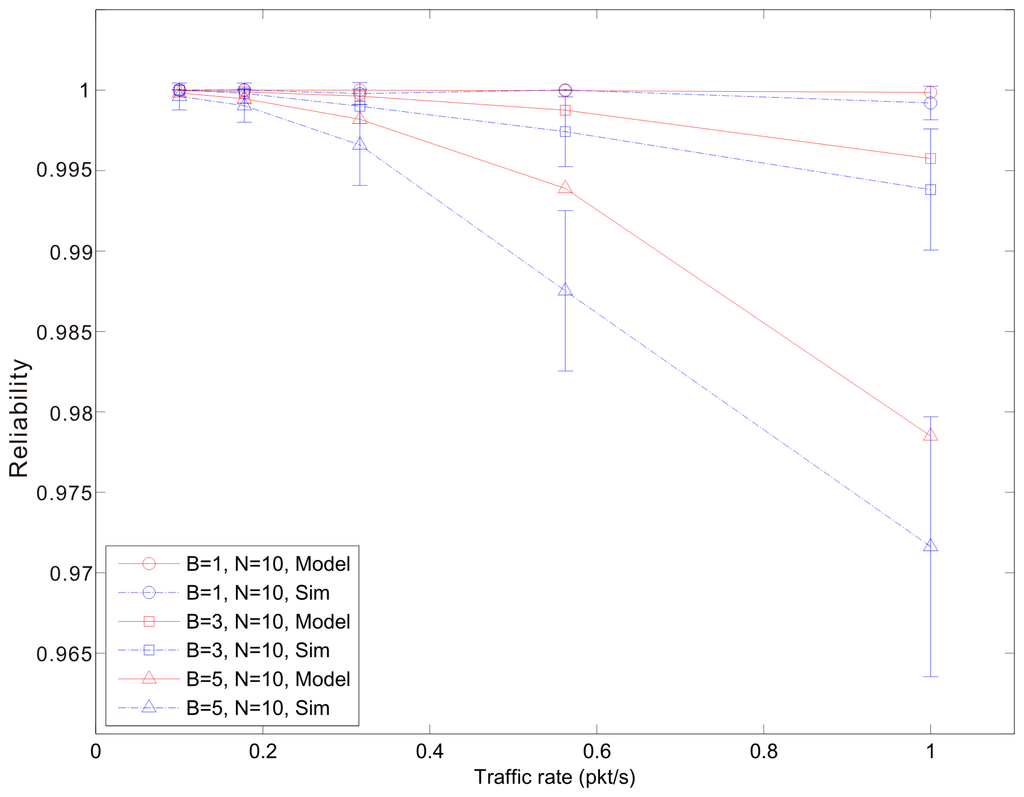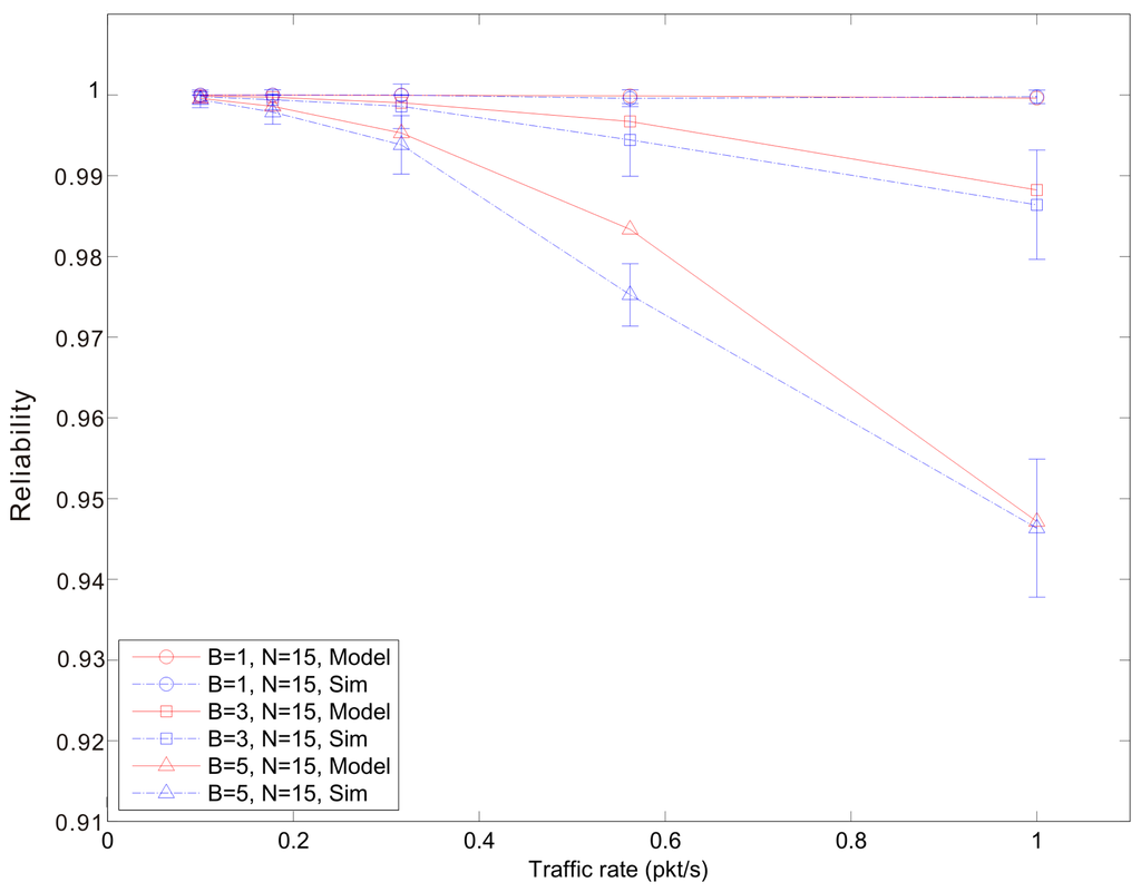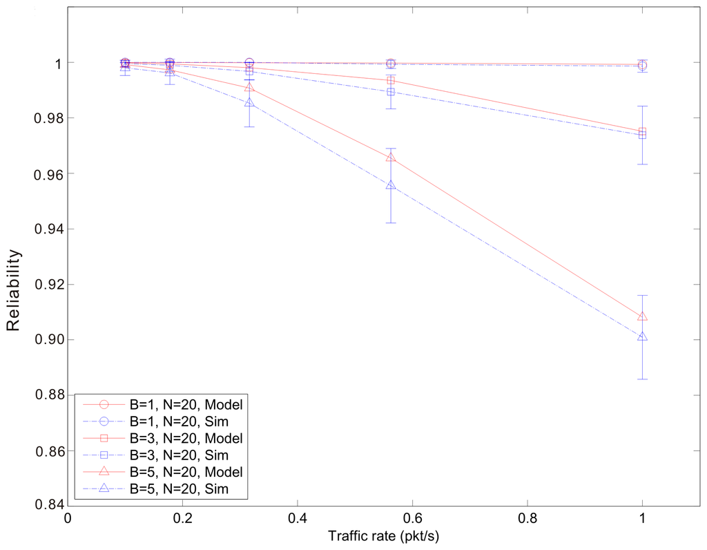 Figures 7, 8 and 9 show the average reliability of CoAP blockwise transfer computed over all the links for a star topology network with mixed traffic conditions. Figures 10, 11 and 12 show the average reliability of 6LoWPAN fragmentation for the same scenario. A good agreement between simulations and analytical results of the model is observed. The reliability performance of 6LoWPAN fragmentation and CoAP blockwise transfer is very similar in the considered scenarios. The difference between the reliability values is lower than 2%. In particular, CoAP blockwise transfer has a slightly better reliability when the traffic conditions congest the WSN, which is the case for N = 20, B = 5 and λ greater than 0.8 pkt/s. In these conditions blockwise improves reliability by the 0.96% respect to 6LoWPAN fragmentation.