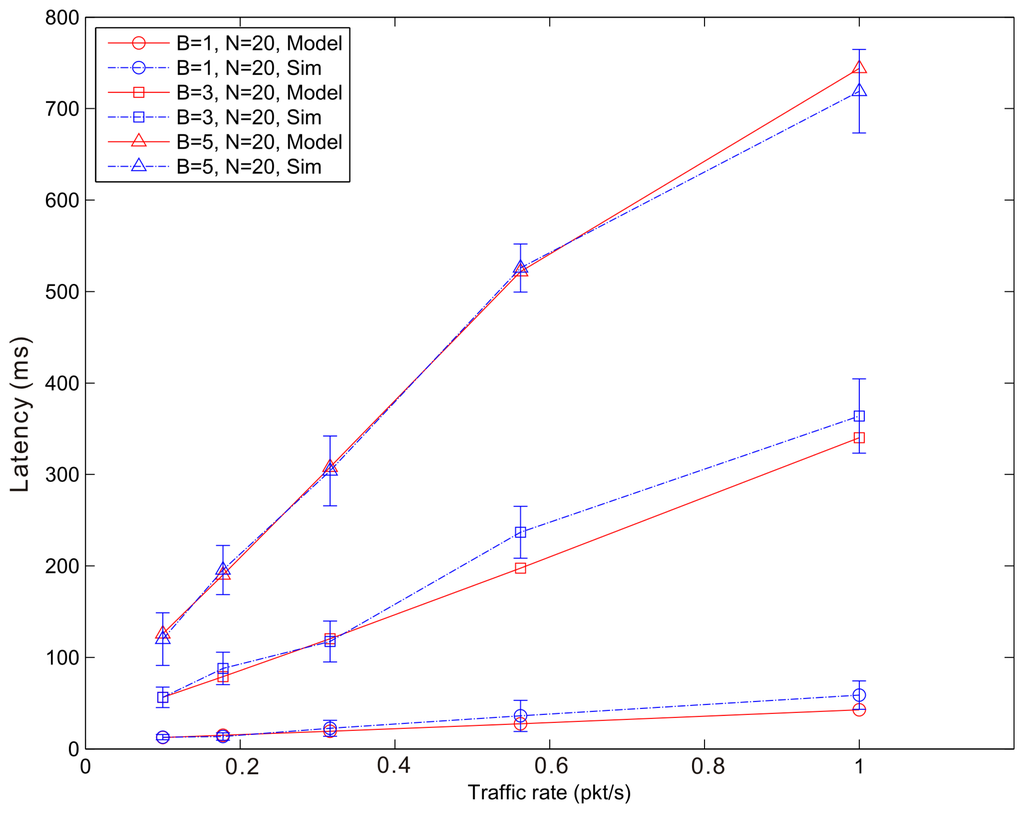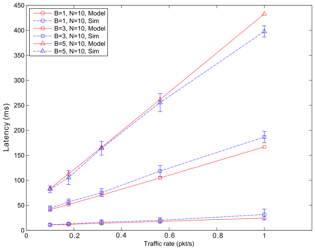 In this section we validate the model by Monte Carlo simulations and present the results of the performance evaluation. We base the simulation parameters on the specification of the IEEE 802.15.4 [2] and CoAP [7] protocols. We evaluate our models with different values of the traffic pattern and for CoAP updates composed by a variable number of fragments and blocks. The MAC parameters are selected as m0 = 3, mB = 5, m = 4, n = 0, in accordance with the 802.15.4 standard [2]. The MAC frames have size L = LACK = 127 bytes and the MAC ACK frame LMAC ACK = 11 bytes. We study various traffic and fragmentation scenarios by considering N = [10, 15, 20] nodes with update generation rates λ = [0.1… 1] pkt/s ad updates divided into B = [1, 3, 5, 7] blocks (in CoAP blockwise transfer) or F = [1, 3, 5, 7] fragments (in 6LoWPAN fragmentation). As previously mentioned, the generation rate λ is constrained by the value of the minimum RTO recommended by CoAP [7]. In this sense, the timeout is RTO = 1s with a random backoff of 0.5s. The number of retransmission is set as c = 1.