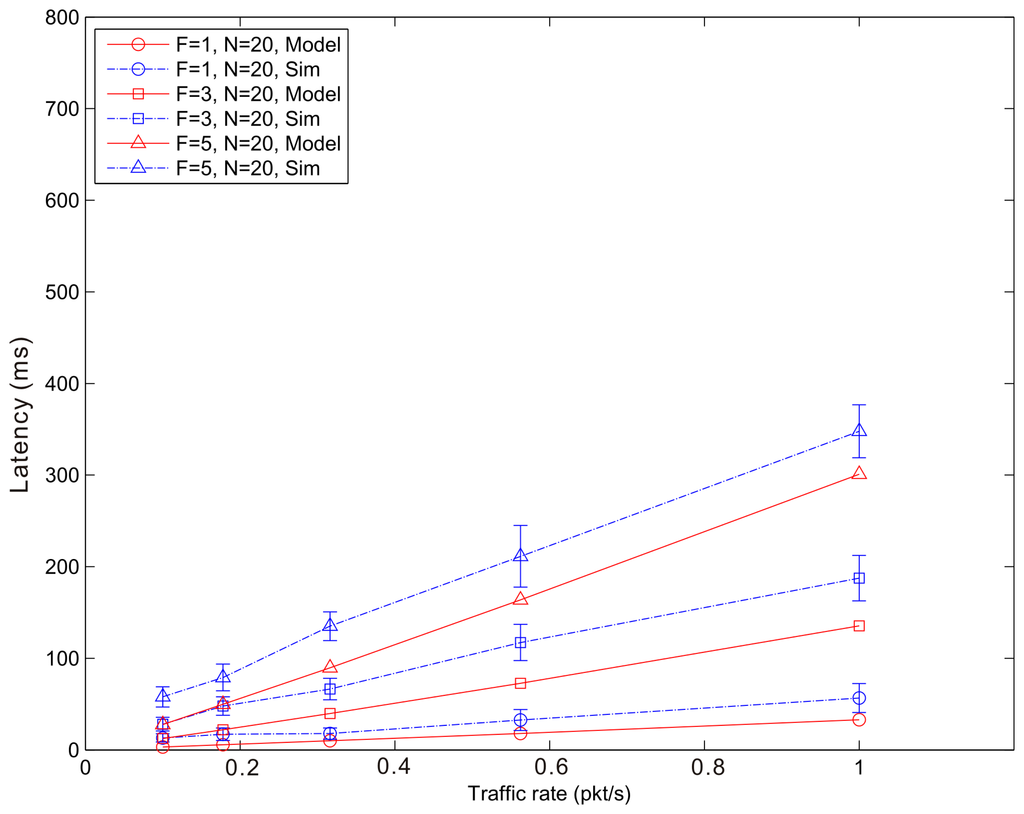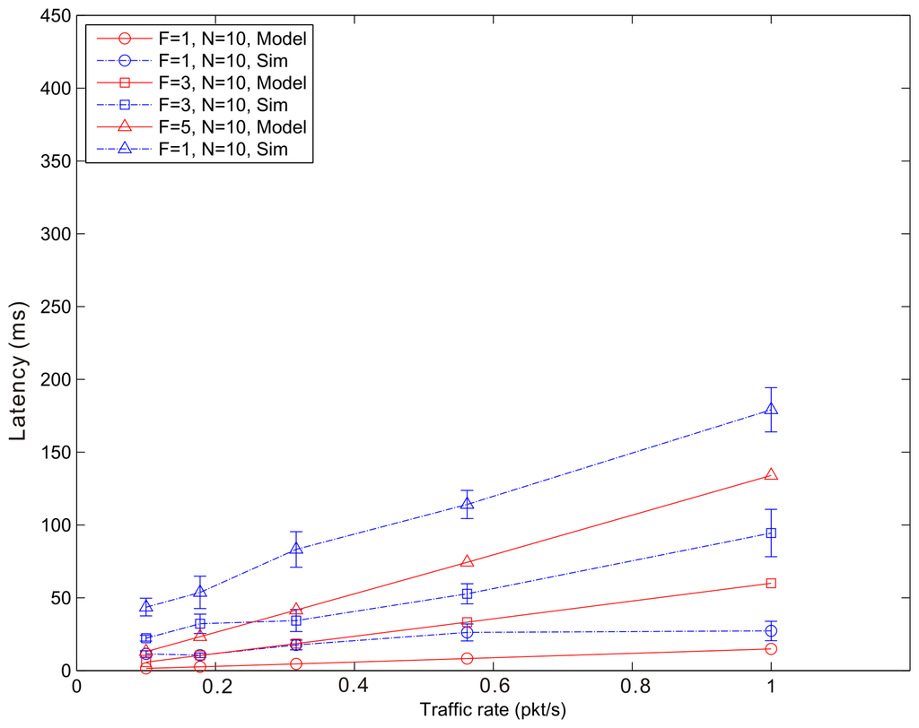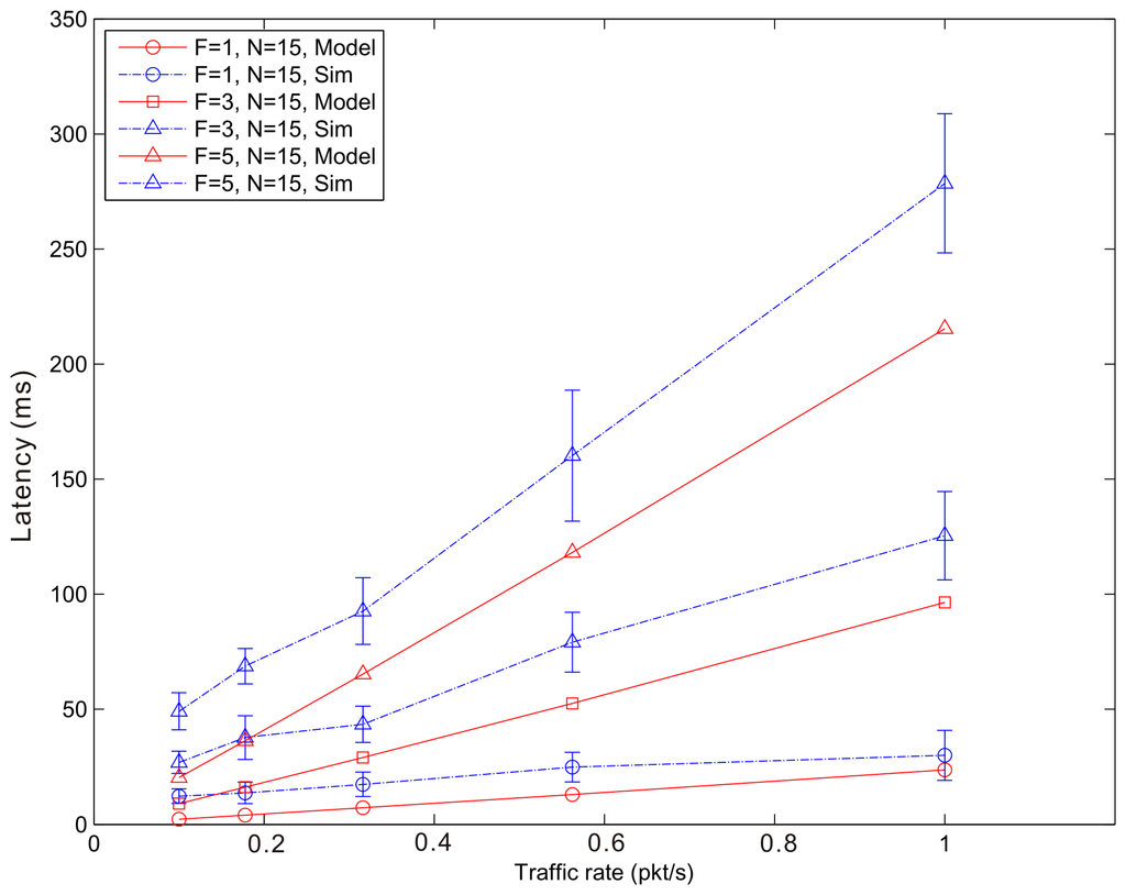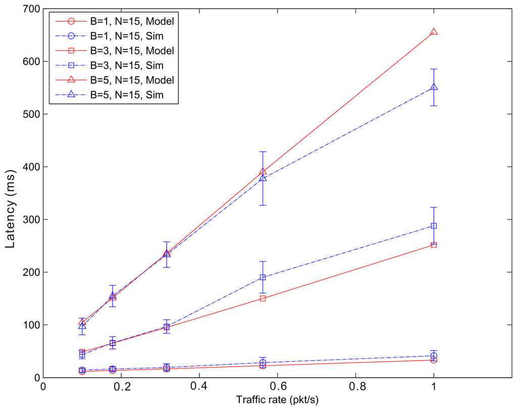 Figures 14, 15 and 16 show the average latency of CoAP blockwise transfer computed over all the links for a star topology network with mixed traffic conditions. Figures 17, 18 and 19 show the average latency for 6LoWPAN fragmentation. A good agreement between simulations and analytical results of the model is observed.