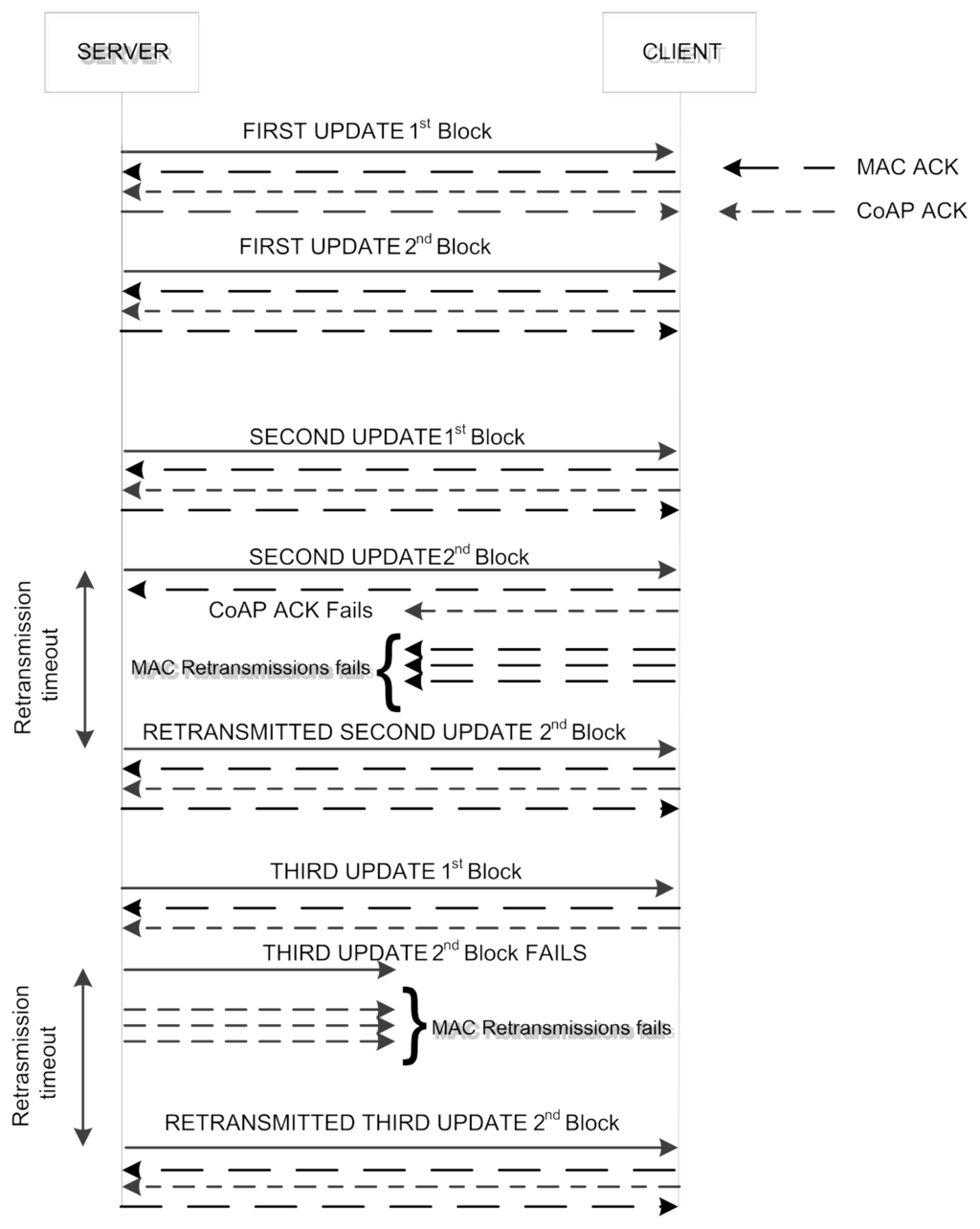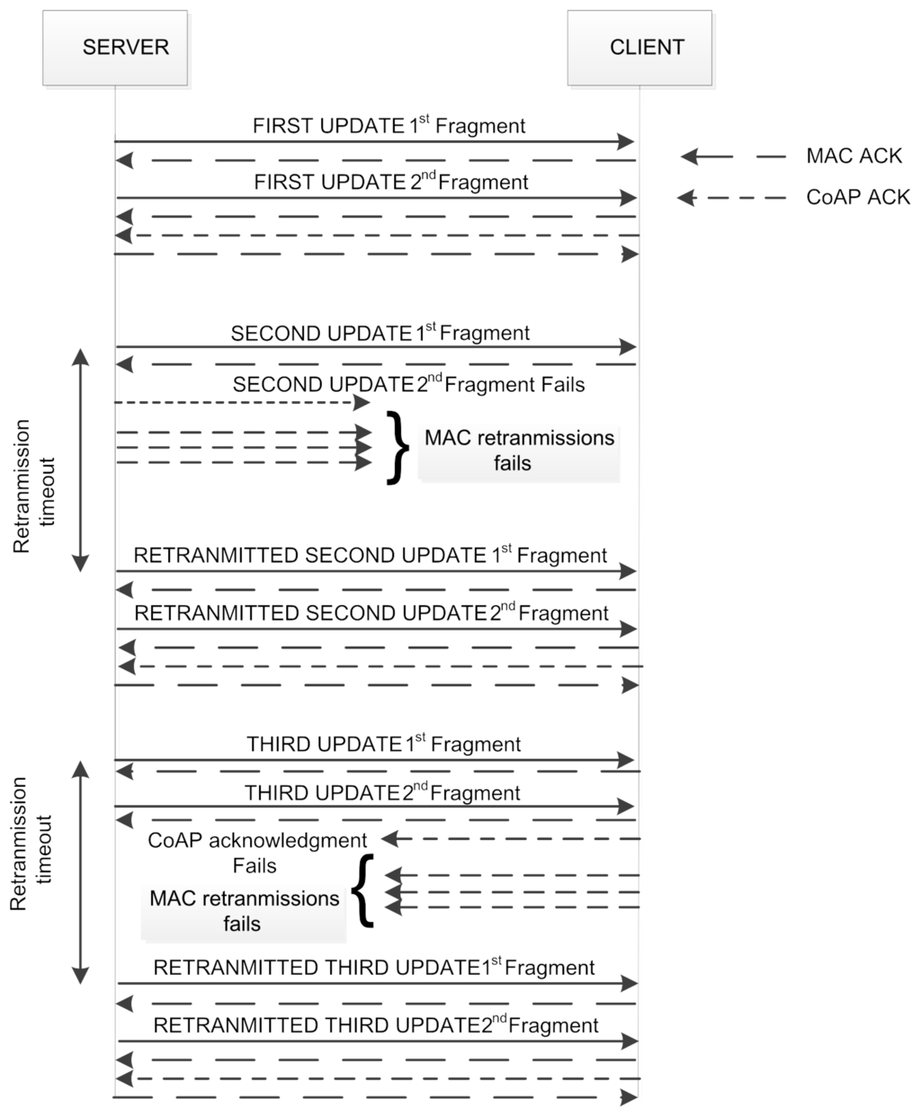 With reference to Figure 2, the server retransmits the second update after the expiration of the CoAP retransmission timeout (RTO) [7], which is consequent to the failure of both the transmission of the second fragment and that of the relative MAC retransmissions. The update is then retransmitted successfully. The third update instead, is retransmitted after all the MAC retransmissions of the CoAP ACK fail.