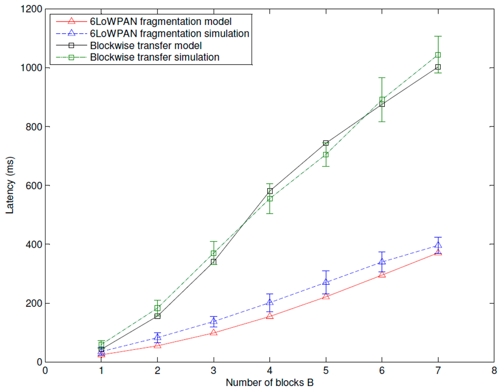 According to our performance evaluation, 6LoWPAN fragmentation outperforms CoAP blockwise transfer in terms of latency independently from the update generation rate and the number of nodes. The difference between both techniques becomes higher with the growth of the update generation rate and the number of fragments or blocks involved in the communication. As mentioned, 6loWPAN fragmentation requires the interchange of fewer messages than CoAP blockwise transfer. Consequently, the latency of an update transmission is significantly lower than that experienced by CoAP blockwise transfer. The performance of CoAP blockwise transfer, however, could be improved by considering block sizes that allow sending a single block in more than one frame. This would reduce the number of CoAP ACKs and consequently the latency performance would improve. However, its performance would be always lower than that of 6LoWPAN fragmentation, which represents an upper bound to the performance of CoAP blockwise transfer. 6LoWPAN fragmentation could be considered as a particular case of CoAP blockwise transfer with a block size that allows sending a single CoAP ACK.