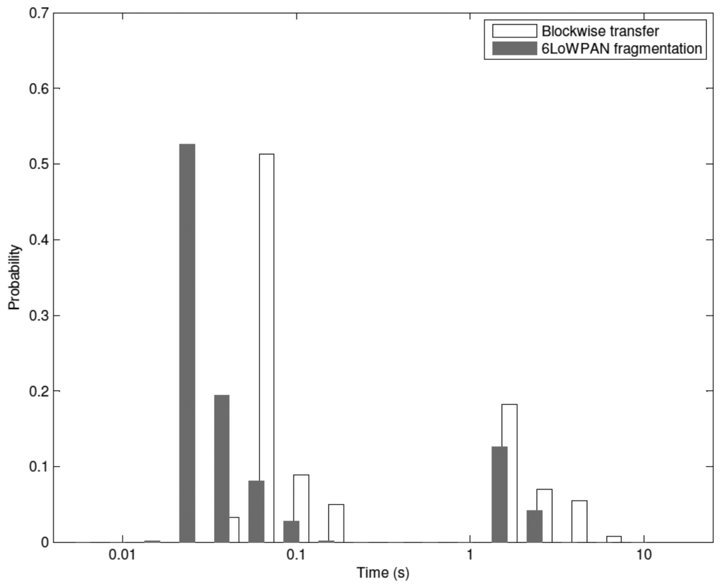 This behavior can be explained analyzing the Probability Density Function (PDF) of the latency, which is shown in Figure 21. It is evaluated in a star topology WSN composed by 15 nodes with a traffic rate of 1 pkt/s and updates composed by five fragments or blocks. The distribution of both solutions presents a long tail, which is due to the effect of retransmissions. The presence of block-to-block retransmissions causes the tail of CoAP blockwise transfer to be the longest one. This further worsens its average latency and causes the rapid growth of its curve. In CoAP blockwise transfer each block of an update could be retransmitted. The overall latency would be higher than that of retransmitting the entire update as done by 6LoWPAN fragmentation. We remark that reliability and latency can be competing requirements and a trade-off is needed to guarantee low energy consumption. The model can be used within a constrained optimization framework for the selection of protocol parameters and fragmentation techniques.