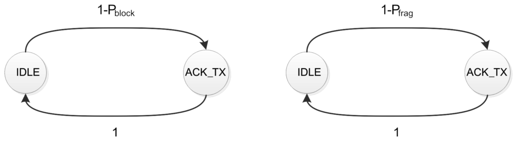 The server is in the IDLE state when it is waiting for the generation of the next update. The transition probability from the IDLE to the transmission state of the fragmented update (TX) or the first block (BLOCK_1 TX) is the probability ql that we derived in Equation (1). The server goes back to IDLE state after it receives the CoAP ACK relative to the last block or fragmented update. The failure of the update transmission also causes the server to go back to the IDLE state.