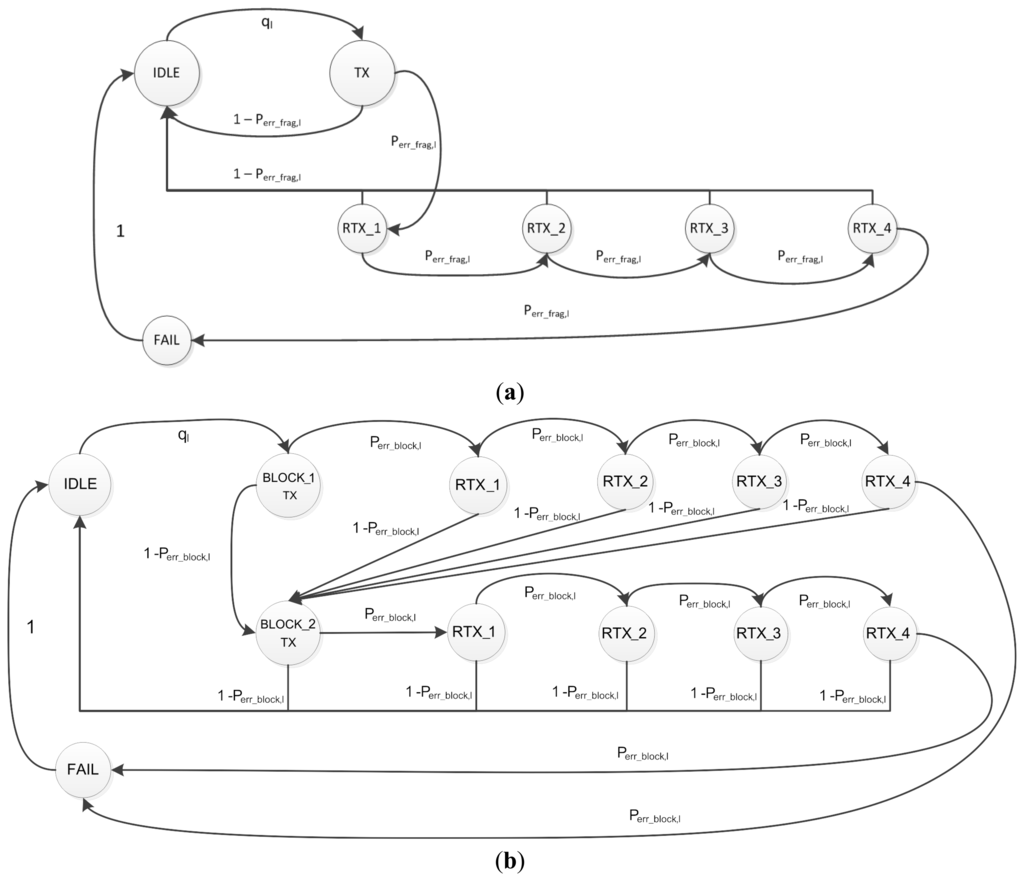 The retransmission states are visited after the failure of the transmission of a block, fragment or CoAP ACK. The transition probability between the transmission state and the first retransmission state of the blockwise and fragmentation models are expressed as and , respectively. These probabilities are also valid for the transition between the retransmission states.