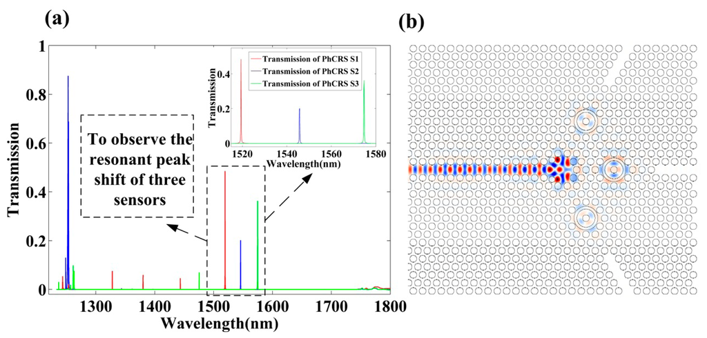The output transmission spectra obtained for the optimal three ring-slot cavities are shown in Figure 2a, and the steady-state electric field profile is shown in Figure 2b. As seen in Figure 2a, the transmission efficiencies have response peaks at 1519.44 nm, 1545.72 nm, 1574.65 nm in a water environment (RI = 1.330) with respect to the red solid line, blue solid line, green solid line, respectively, and the Q factors of the three peaks are equal to 11,029, 10,153, 10,669, respectively, and three peaks surrounded by black dashed line are chosen to observe the resonant wavelength shift of integrated three sensors when the RI in the functionalized area is varied.