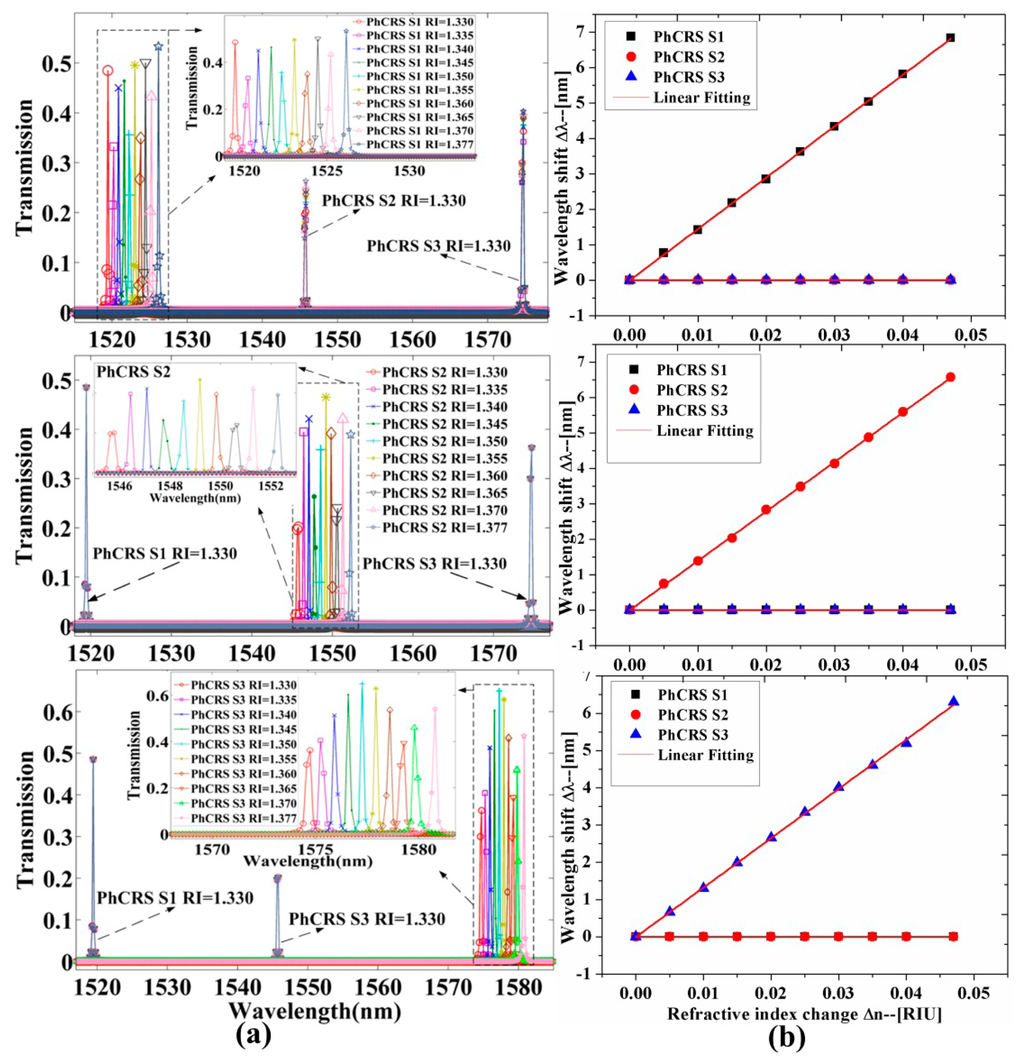 To analyze the properties of the integrated PhC ring-slot sensor array in aqueous solution to implement biosensing, the RI of the functionalized area of three sensors is changed, respectively. Figure 3a shows the transmission spectra of three ring-slot cavities (PhCRSS1, PhCRSS2, PhCRSS3) when the RI of functionalized area of one sensor is changed and the others aren't. As shown in Figure 3a, the upper row shows the transmission spectra and the resonant peaks are red-shifted (longer wavelength) when the RI of functionalized area of PhCRSS1 is changed and the others aren't, and the inset shows the amplified image of the transmission spectra of PhCRSS1 when the RI of functionalized area of PhCRSS1 is changed by 1.330, 1.335, 1.340, 1.345, 1.3501, 1.355, 1.360, 1.365, 1.370, 1.377, respectively. Q factors of more than 104 are achieved for these resonant peaks, and this is higher than ever reported [25,36,37]. We can also find that the transmission spectra of PhCRSS2 and PhCRSS3 are barely transformed when the RI of PhCRSS1 is changed. Similarly, the middle row shows the transmission red-shifted spectra of PhCRSS2 when the RI of PhCRSS2 is transformed, and the lower row shows the red-shifted transmission spectra of PhCRSS3 when the RI of PhCRSS3 is changed.