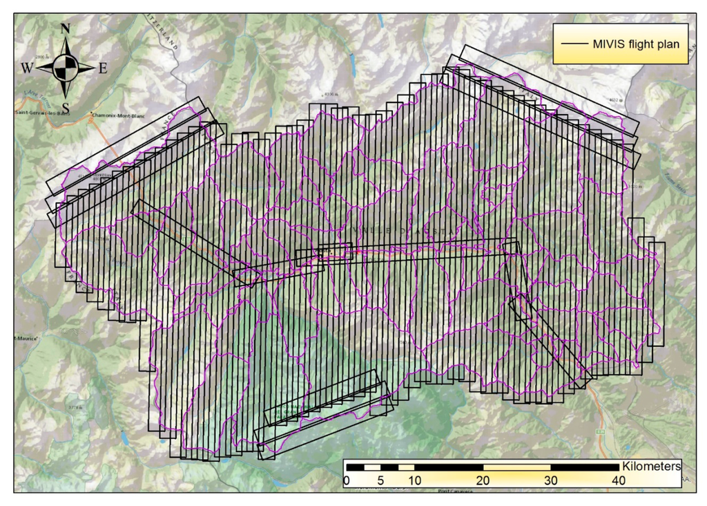 The data used in this study were collected with the MIVIS sensor, an airborne hyperspectral scanner featuring 102 spectral bands from visible to thermal infrared with a 2 milliradians instantaneous field of view []. Table 1 shows a summary of its main characteristics. At the beginning of Fall 1999, the RAVA territory was surveyed with MIVIS. The flight plan included seventy transect strips of which sixty one were used (Figure 2):