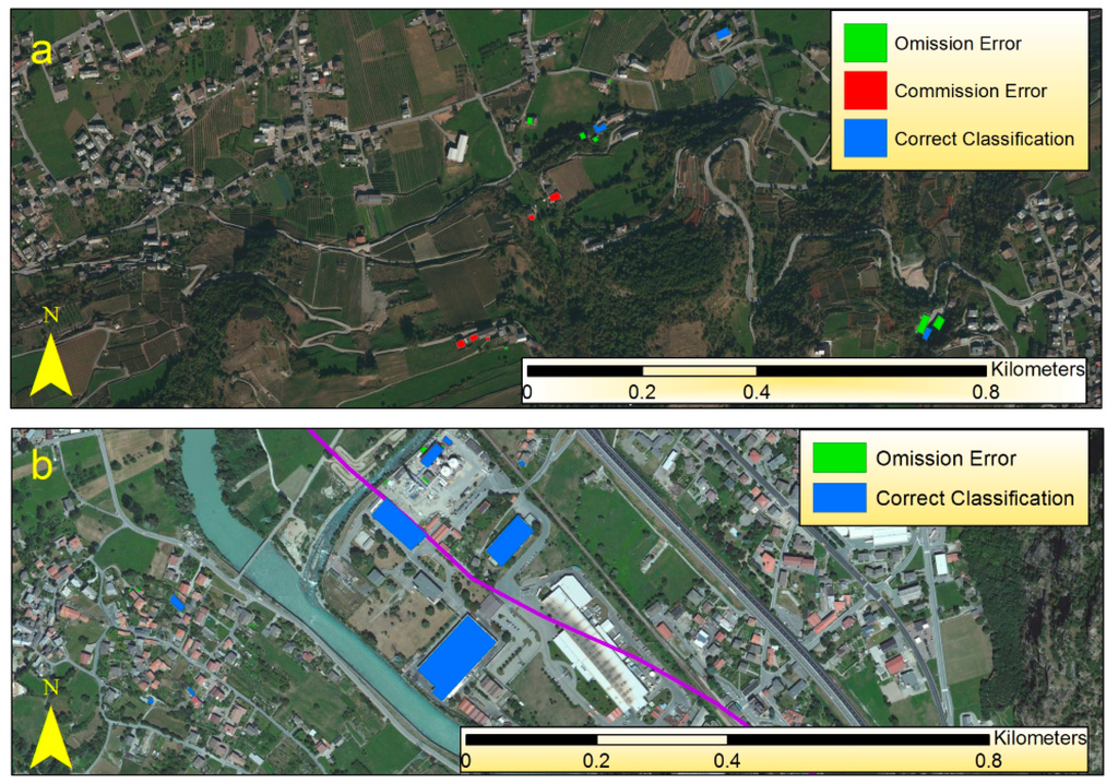 A peculiarity of this research is its validation. Usually, map validation is based on some (few) spots surveyed but here all the buildings in RAVA were checked for accessing the reliability of the methodology. This means that the validation statistics were calculated on all the existing asbestos-cement roofs, thus correct classification and error rates were not extrapolated form a testing subset.