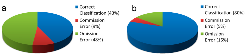 With respect to asbestos-cement roof units, validation showed a large omission error (OE) but a small commission error (CE): almost half of the ground surveyed roofs were not detected with the MIVIS survey (false negatives), thus omitted in the thematic map, while less than 10% were misclassified (false positives) and representing error of commission. While some of the CE may be related to roofs reclaimed from 1999 to 2011 but not included in the ASL list, OE could be mainly explained in terms of the geometric resolution of the data set. In fact, looking at the statistics computed in terms of asbestos-cement roof area (Figure 5b, Table 2) the overall correct classification (CC) increased to 80% and the OE decreased to 15%. In other words, 80% of the asbestos-cement roofing were correctly detected from aircraft but most of the smaller covers were omitted. Thus, this method tends to underestimate the presence of asbestos-containing roofs.