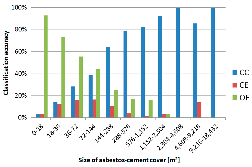 Figure 6 shows the same phenomenon more in details. The graph clearly highlights the increase of correct detection rates and the decrease of classification errors with the increase of the size of the asbestos-cement roofs. If we consider the valley bottom, where the MIVIS data has a nominal spatial resolution of 4 m, and assume that at least a window of 3 × 3 pixel containing asbestos is needed for a correct detection (no unmixing techniques were used in this study), then only roof size larger than 144 m2 (RSLT144) will be classified with a reasonable confidence. This outcome is consistent with similar recent results reported by independent authors [], as discussed later on. Regarding the RAVA case study, statistics for RSLT144, computed in terms of number of asbestos-cement roof units, improved significantly with respect to statistics for the whole data set: CC raised from 43% to 75%, while CE and OE dropped from 9% to 6% and from 48% to 19%, respectively.