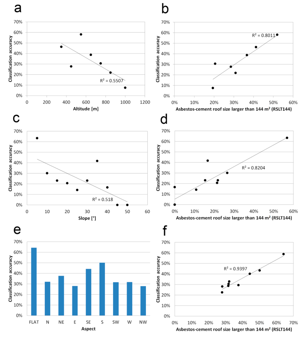 Regarding the aspect, the range was divided into 8 classes (i.e., North, North-East, East, South-East, South, South-West, West and North West) with the addition of the class “Flat” (i.e., no aspect). In this case, the highest classification's accuracies were obtained for the classes “Flat” (64%) and “South” (50%), as shown in Figure 7e. These results can be explained again in terms of percentage of RSLT144 in each aspect class. In fact, flat areas and South-facing slopes contained much more large asbestos-cement roofs than the other aspects. Thus, a strong correlation (R2 = 0.94) was found between the percentage of RSLT144 of aspect classes and the classification accuracy (Figure 7f).
